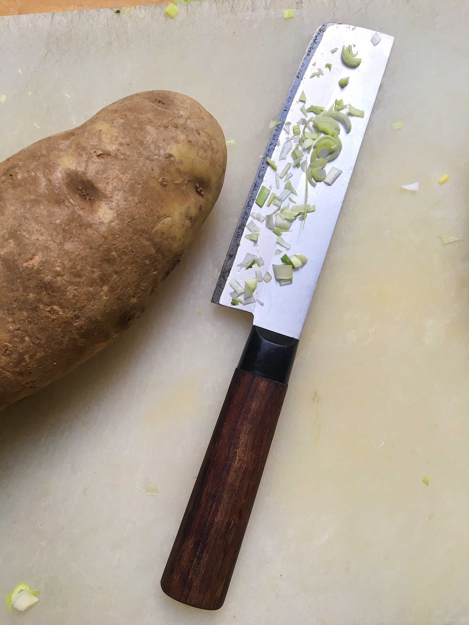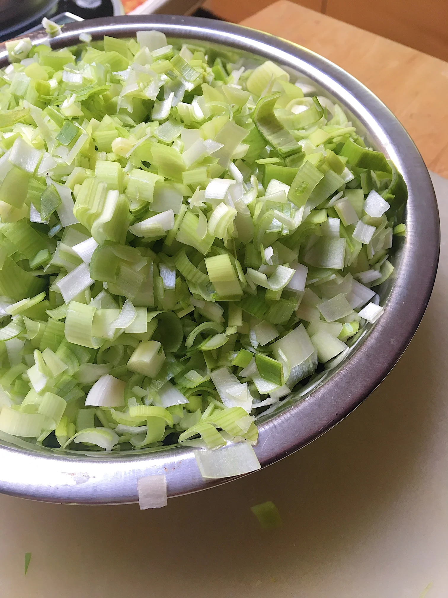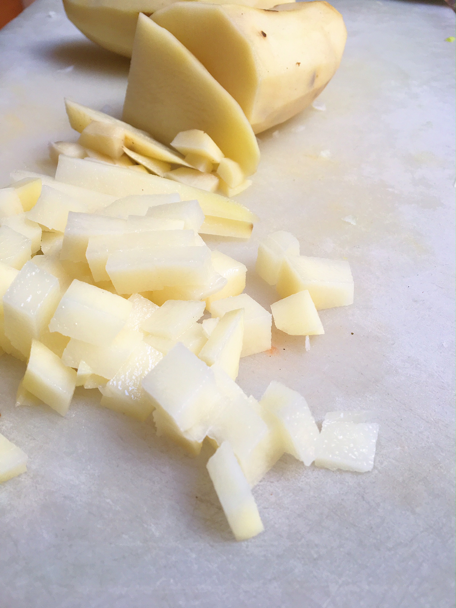 - Peel and dice the potatoes. Peel and slice the leeks and onions.